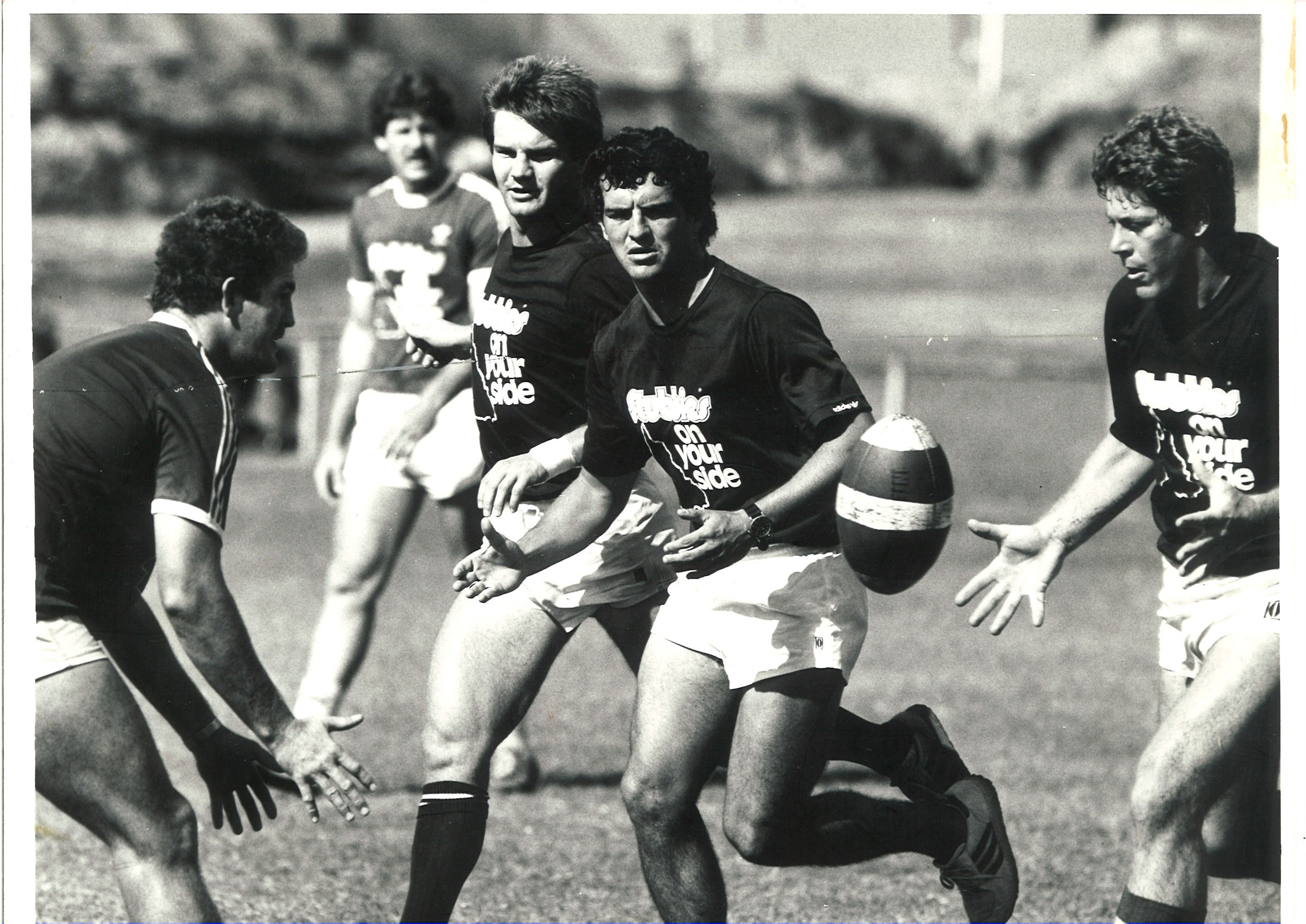 Greg Conescu (centre) at Queensland training with Greg Dowling passing to Wally Fullerton Smith. Mark Murray is on Conescu's right.