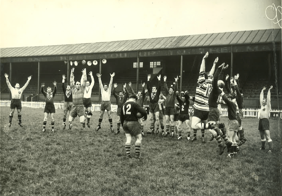 Clive Churchill leads the Australians in a war cry practice during the 1956/57 Kangaroo tour. Photo courtesy of the family of Cyril Connell and the Queensland Rugby League History Committee